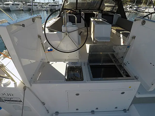 Heating, Refrigerator, Barbecue grill in cockpit, Bimini, Cockpit cushions, Sprayhood, Outboard engine, Dinghy, Wi-Fi & Internet